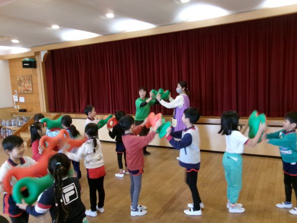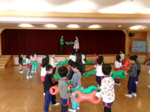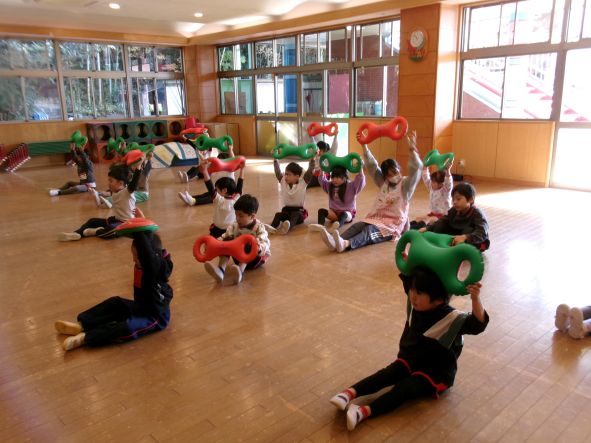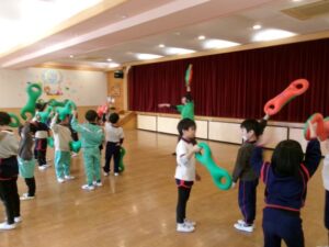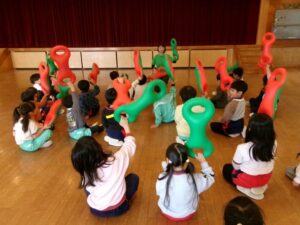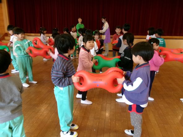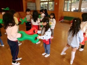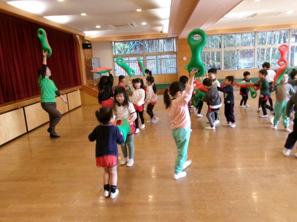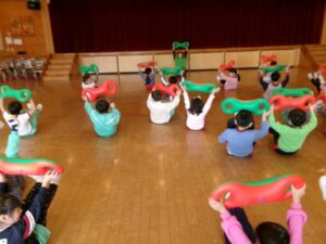 音楽に合わせ道具をつかい全身をつかって体を動かしています。お友だちと一緒に体を動かすのも楽しいようです。