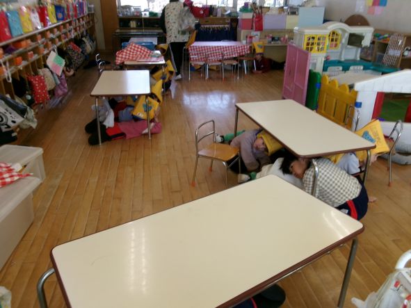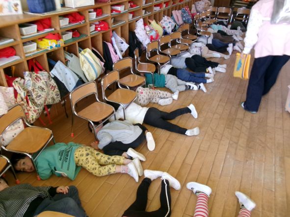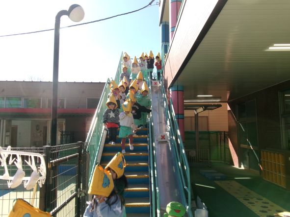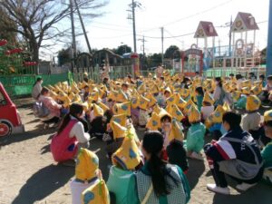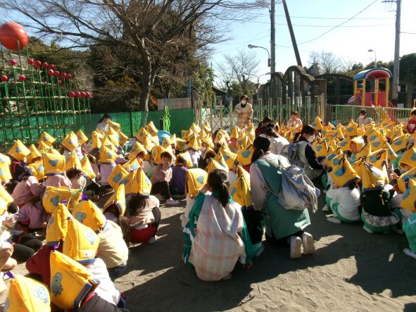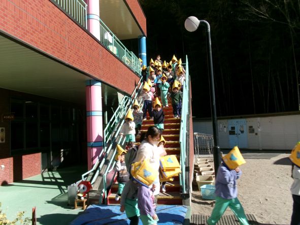 今回の避難訓練は時間を知らせずに行いました。先生も知りません。実際に起きる地震や火事はいつ起こるか分かりません。突然の放送にトイレに行っている子、テラス、お外で遊んでいる子みんなそれぞれの場所で活動していましたが、瞬時に避難の行動に移していました。一年間の避難訓練での経験が活かされた訓練になりました。