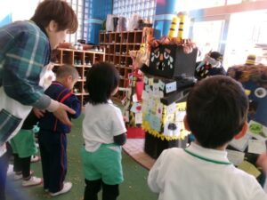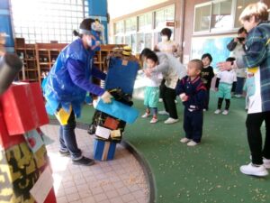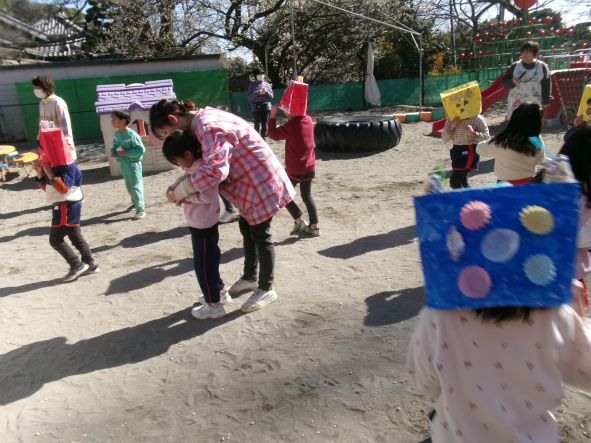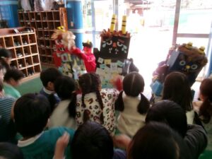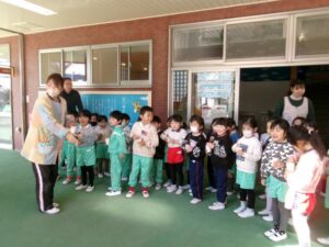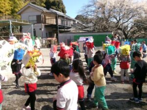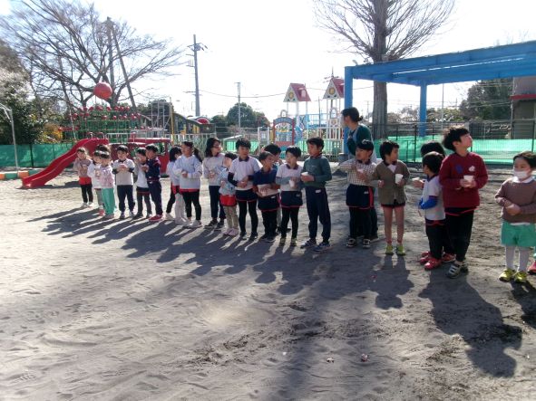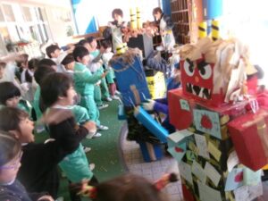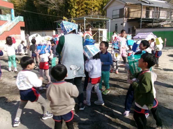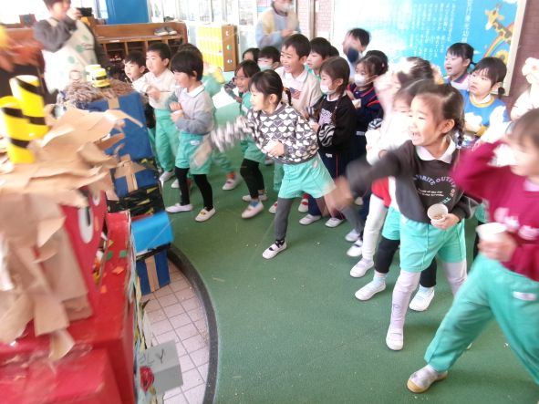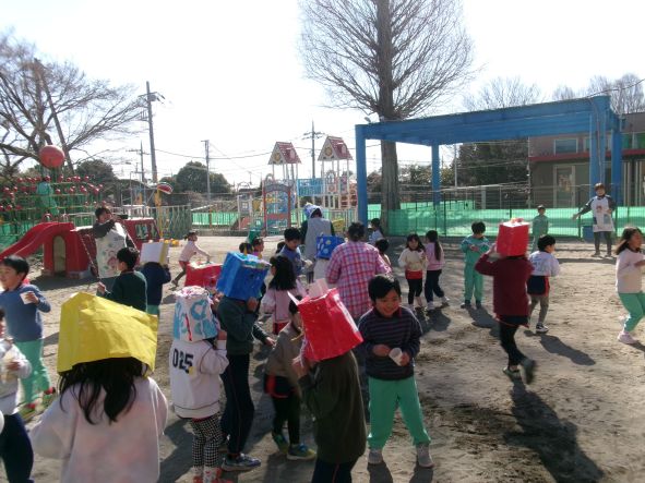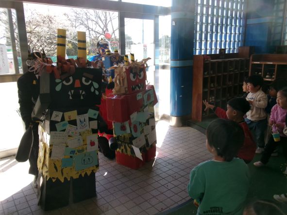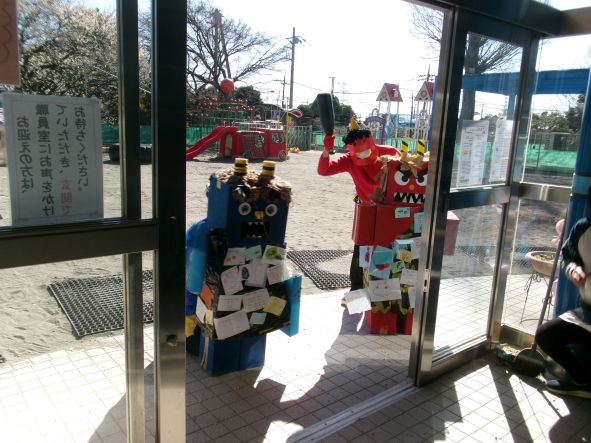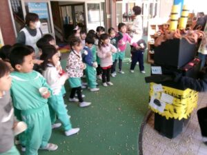 今日は節分。「悪い鬼を退治するぞ!」とみんな勇ましく豆まきをしました。
