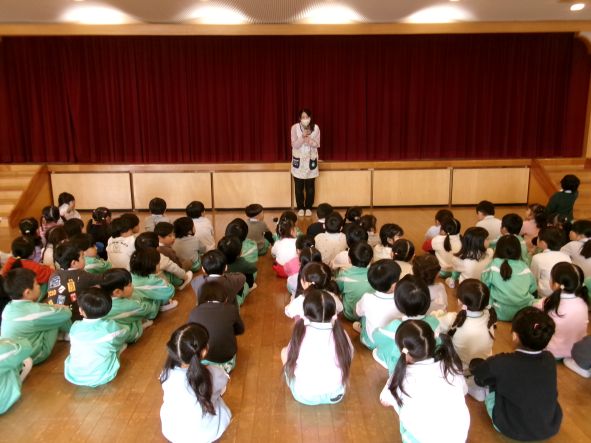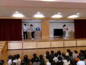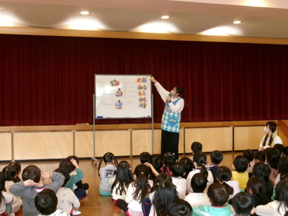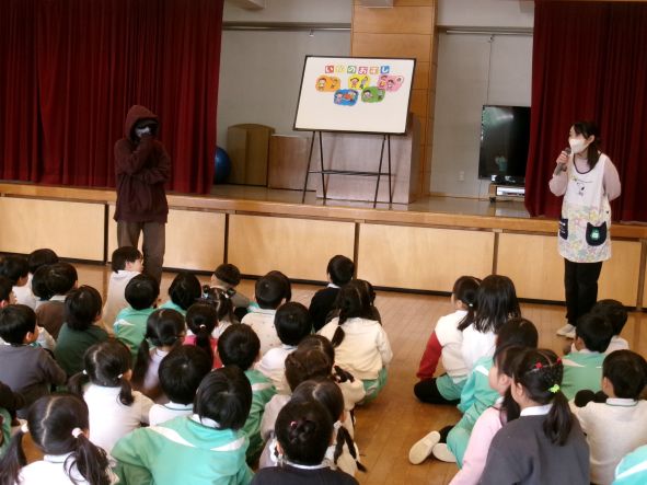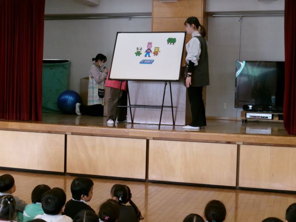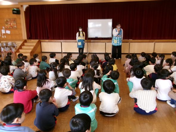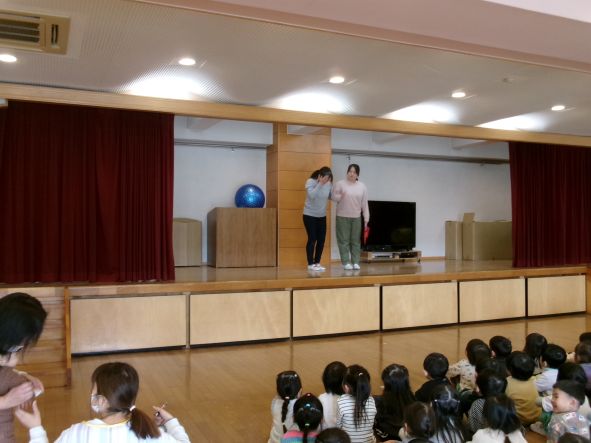 年中組さんはパネルシアターでわかりやすく伝えました。年少組さん、いちご組さんは先生たちの劇で子どもが防犯にイメージを広げられるように伝えました。 みんなが心に残る防犯訓練になりました。