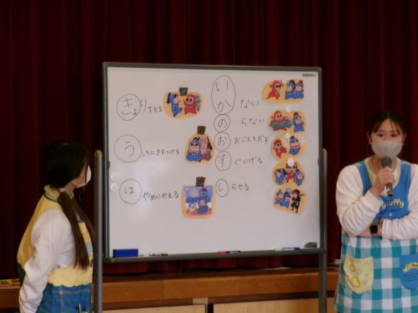 年長組さんは先生達からのお話で子どもたちとひとつひとつ確認をしながら進めていきました。合言葉は「きょうは、いかのおすし」きょ:距離をとる。う:後ろに気をつける。は:はやめに帰る。いか:知らない人についていかない。の:のらない。お:大声をあげる。す:すぐ逃げる。し:知らせる。