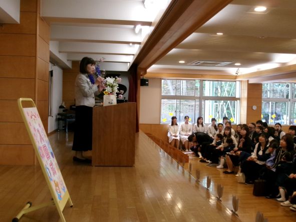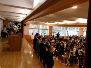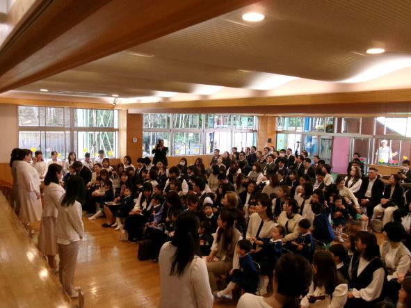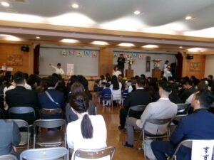 ご入園おめでとうございます。いちご組から年少組になったお友だちと、新しく年少組から入園したお友だちと一緒に入園式を行いました。保護者の方に見守られ和やかな入園式となりました。