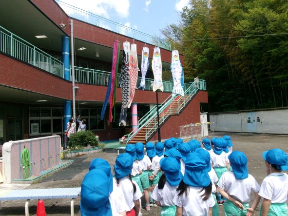 年長組さんは、自分のこいのぼり製作の他に、クラスのこいのぼりも作りました。みんなの手形がうろこになって素敵なこいのぼりが出来ました。大きなこいのぼりに仲間入り。気持ちよく空を泳いでいます。
