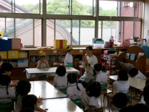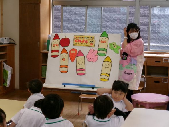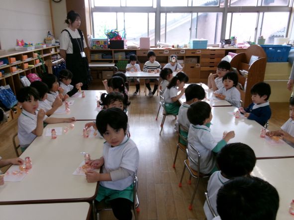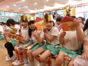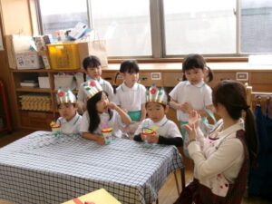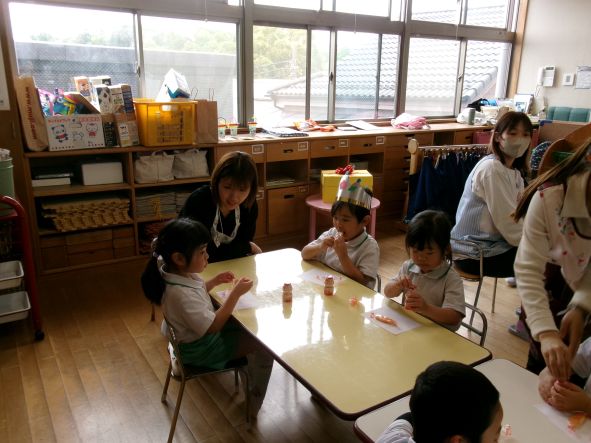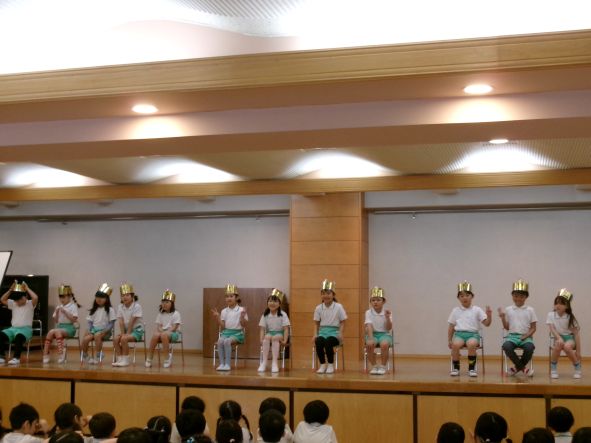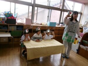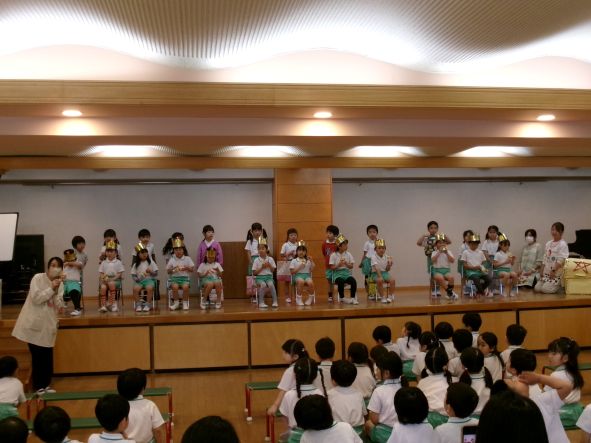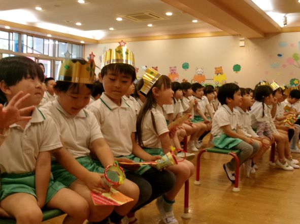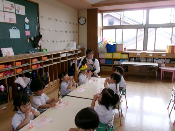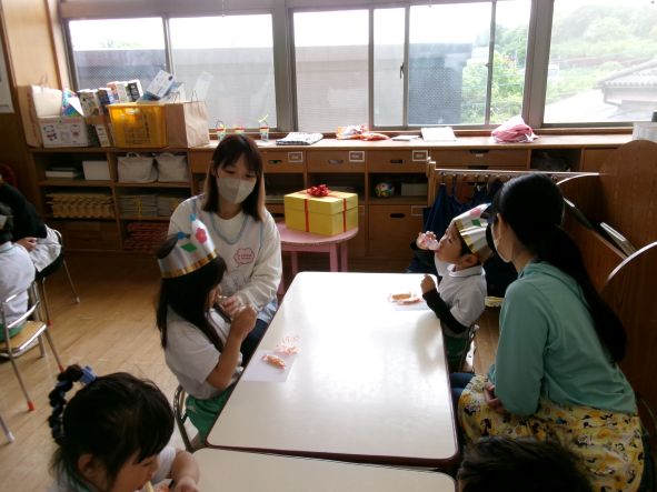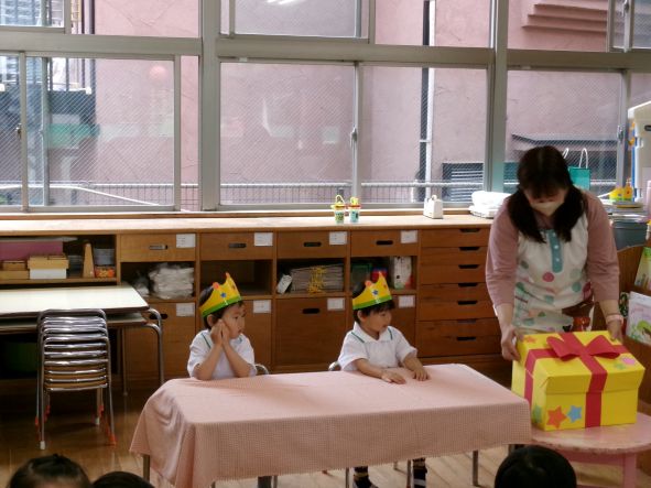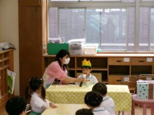 お誕生日おめでとうございます!みんなと一緒にお祝い出来て嬉しそうでした。年長組さんがお誕生児のお友だちにプレゼントを作り届けてくれます。先生からは冠とカードとそして、お楽しみ♡毎月、楽しみにしていてくださいね。